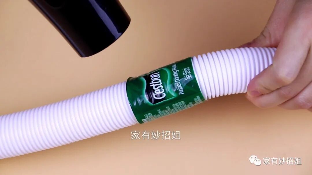 在吹的过程中,我们就可以发现,这个标签纸越来越小。这是因为标签纸是塑料的,而塑料遇到热后,就会慢慢融化收缩。就这样连续吹上一两分钟后,我们就可以看到,标签纸就慢慢的贴合在管子上了。等标签纸完全贴在排水管上,刚刚破损的地方就被堵住,这样排水管就修复好了,接下来我们可以装点水来看看效果。