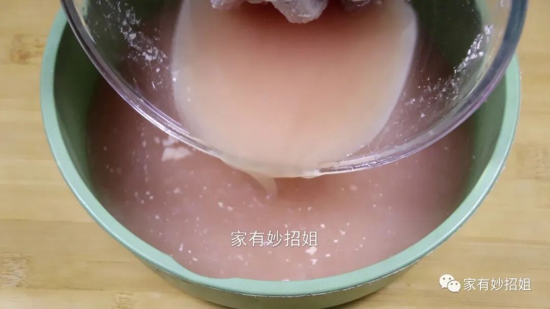 大概揉搓上一分钟左右,我们可以看到面粉的颜色已经变了,它把上面的污垢和血水都已经吸附了下来。