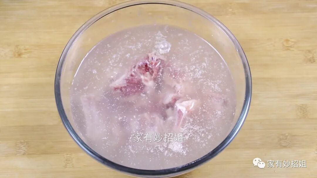接下来,再往里面倒入清水,水要没过排骨,让排骨在水中浸泡5分钟,将排骨中的血水都浸泡出来。