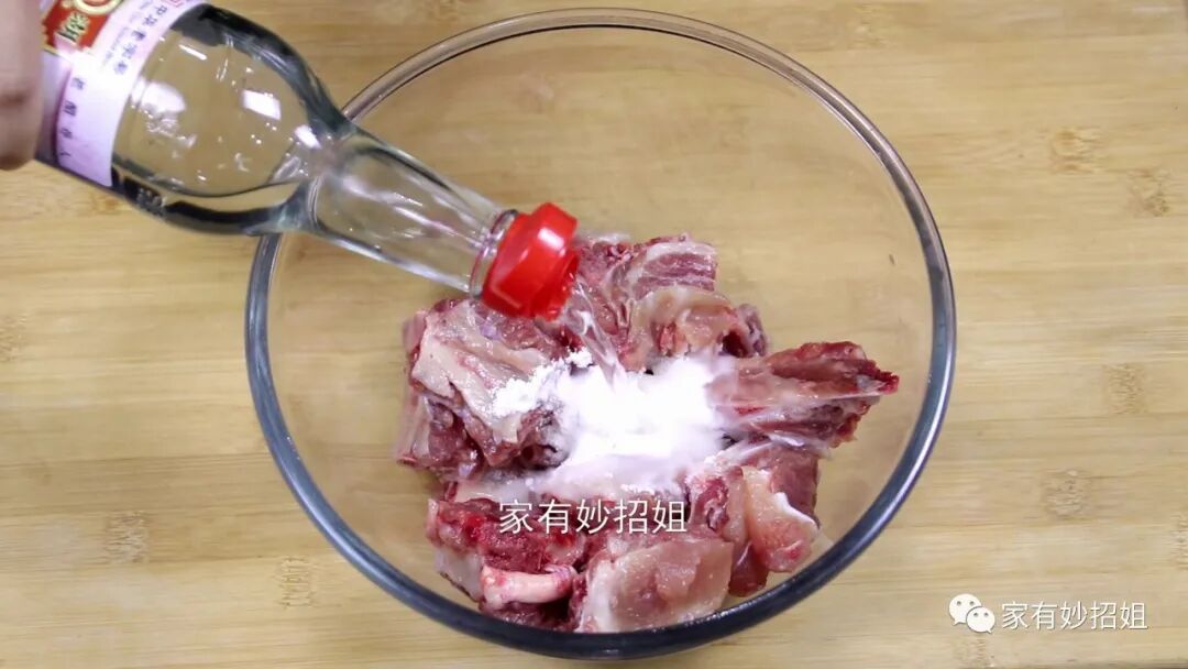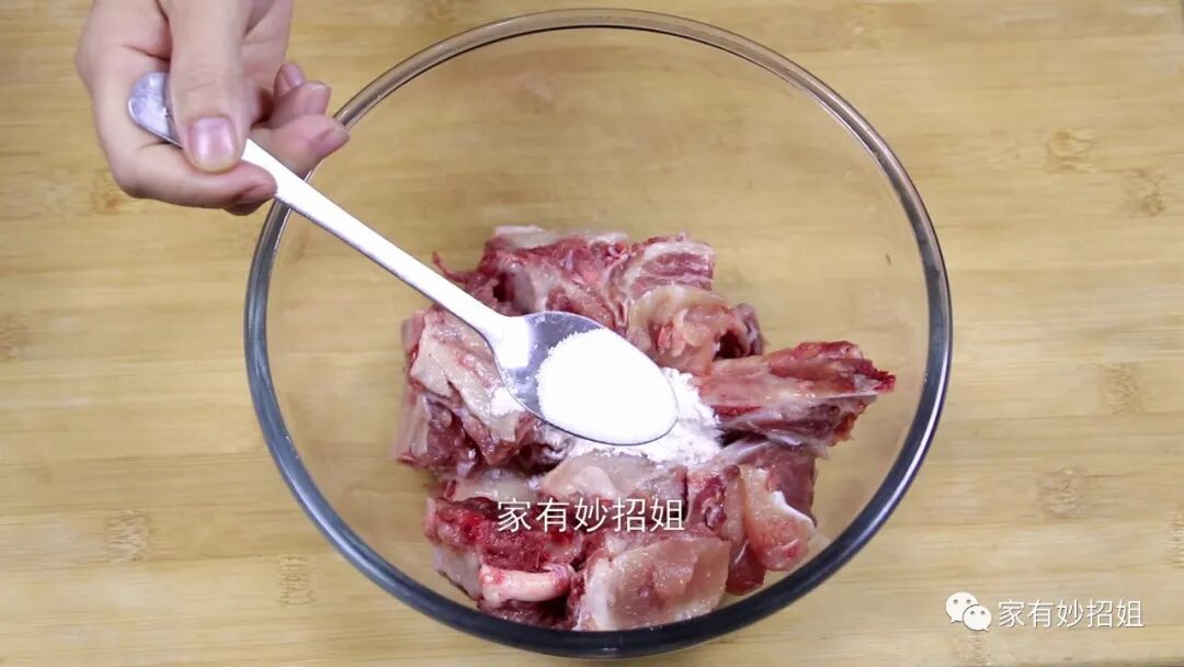 接着,我们再往里面倒入一勺食盐,食盐可以杀菌,能将排骨上沾染的细菌都消灭掉。