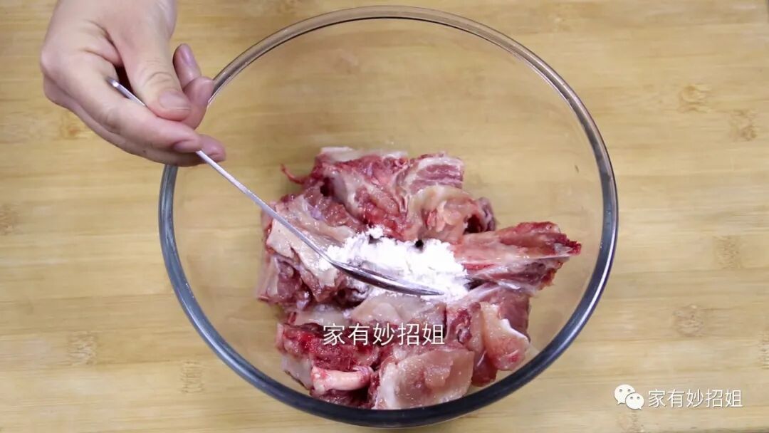 清洗的方法也很简单,我们先将排骨倒在一个大一点的碗中,然后往碗里倒入一大勺面粉,面粉具有吸附的作用,可以将排骨表面附着的油污和脏东西全部粘下来。