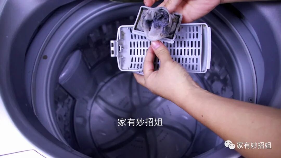 我们只需要轻轻一抠就可以把这个小盒子取下来,而在小盒子的中间会有一个网兜,我们将网兜打开来,可以发现,里面都是长时间没有清洁积累的脏东西。要是不将它清洁干净的话,可能还会滋生细菌。而且里面积的脏物太多,就没办法起到一个过滤的作用,反而将衣服越洗越脏,甚至里面脏东西还会污染到衣服上。