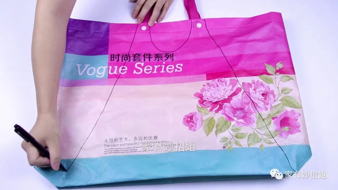 首先我们需要准备一个稍微大一点的手提袋,像冬天我们购买的厚衣服,或者是购买床上用品的时候,这个手提袋都是比较大的,而且质量也会比较好。我们将袋子平铺在桌面上,然后用记号笔标注一下需要裁剪的部分。在袋子上都是有两个提手的,我们在两个提手的中间部分标记出一个u字形。接着,再沿着提手的外侧,画一条弧形连接到袋子的底部,提手的两边都同样标注好。