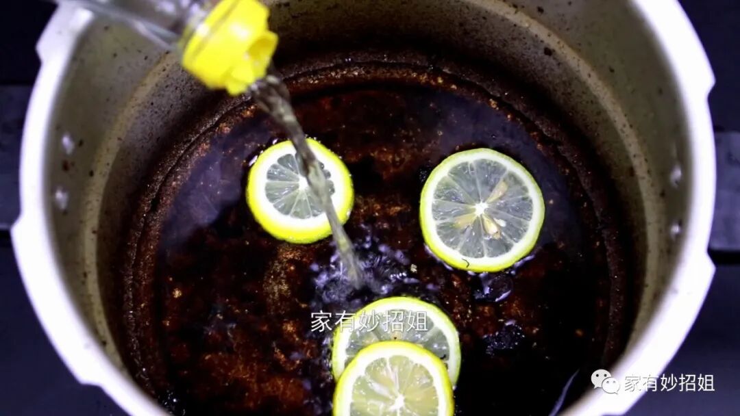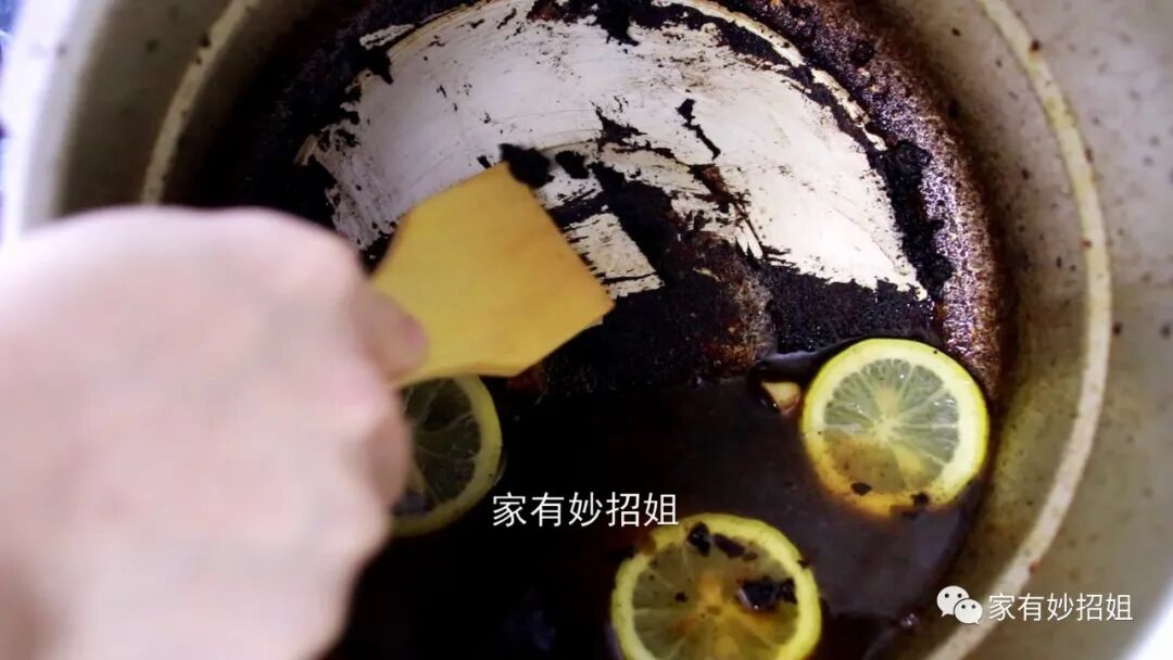 其实清洁的方法也很简单,我们只需要用上家里的一些白醋和半个柠檬就可以了。先将半个柠檬切成片,然后放在烧糊的锅中。接着再往里面倒入白醋,白醋要稍微多倒一点。倒好,我们再把锅拿起来摇晃一下,使锅的四周都沾上白醋。柠檬中的柠檬酸和白醋的醋酸,都具有很强的软化作用,可以将锅底的黑垢软化,就这样让白醋和柠檬在锅里静置上五分钟。