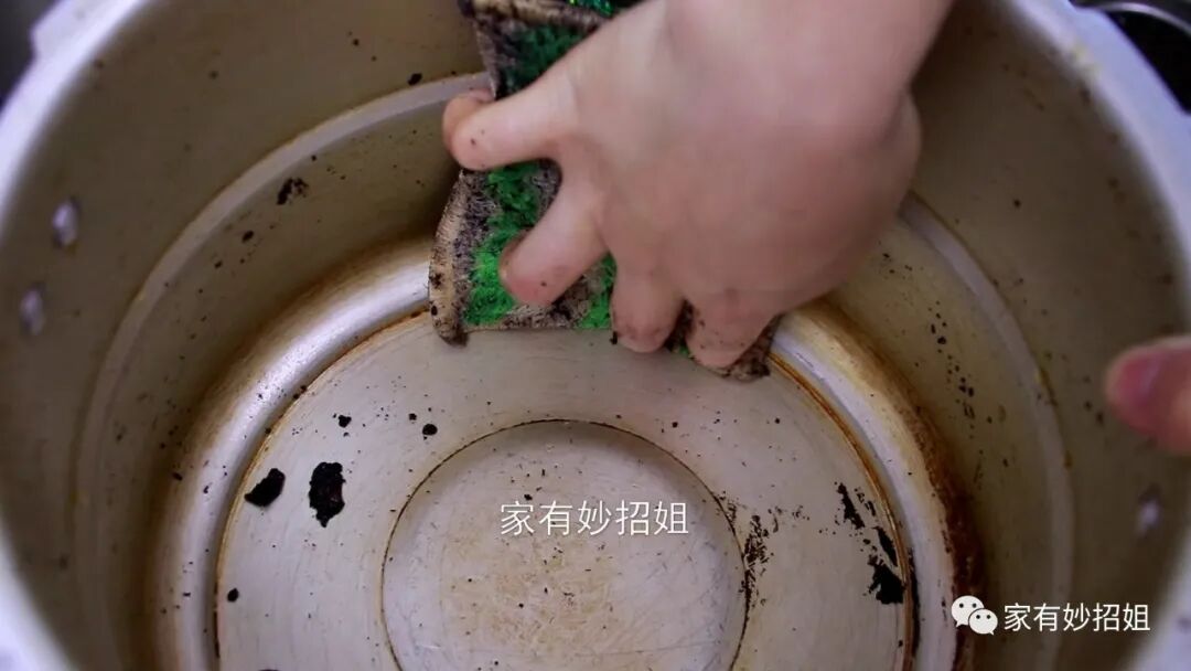 我们将能刮的黑垢都刮下来,剩下的边缘处或没有刮到的部位,我们就可以拿一块百洁布,用百洁布粗糙的一面来刷洗。
