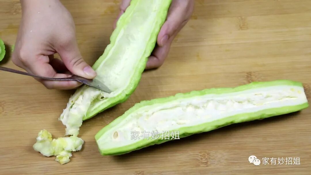 头尾切好,再把苦瓜从中间对半切开。切开后可以发现,在苦瓜的内部是有瓜子的,而且还有很多的白色瓜瓤。平时处理苦瓜,相信很多人只是会将中间的瓜子和白瓤挖掉。但这样简单的处理一下,苦瓜炒出来依旧还是很苦。其实我们将苦瓜中间的瓜子、瓜瓤挖掉后,苦瓜壁上的一些白瓤,我们也要将它彻底的挖干净,这也是苦瓜很苦的一个原因之一。