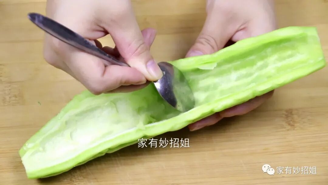 我们在挖这个白色瓜瓤的时候,可以拿一个薄一点的不锈钢勺子,用不锈钢勺来刮,就可以把苦瓜壁上的白瓤刮的更干净一些了。