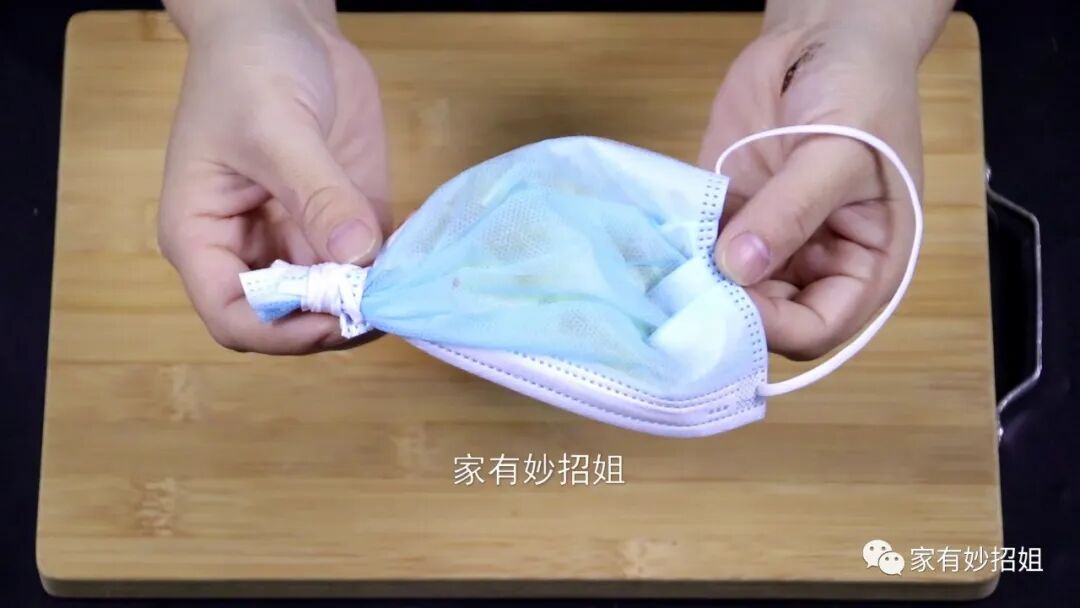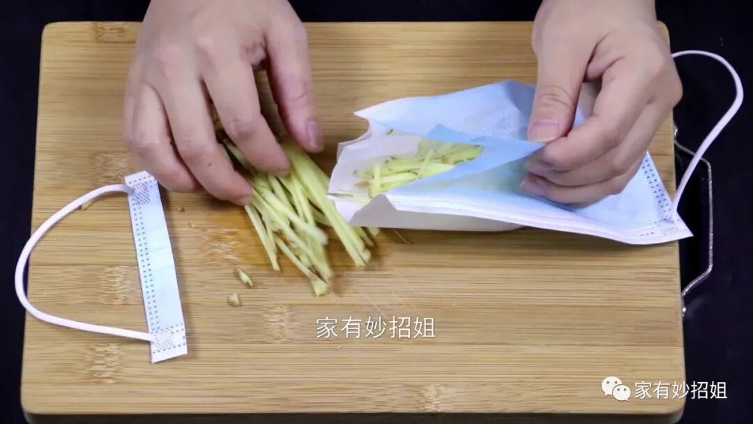 接着,我们再准备一个一次性的口罩,把口罩的一端剪开,再将切好的姜末都放在口罩里面。然后用剪下来的挂耳绳把口罩扎紧,那么这样一个助眠的生姜包就做好了。