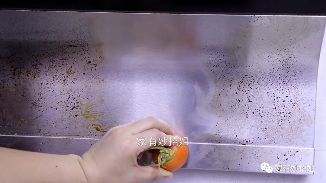蒸的时间差不多了,我们趁热把胡萝卜头拿出来,然后用它来擦拭油烟机的油垢处。经过简单的擦拭几下,我们就可以发现,附着在油烟机表面的油污就被溶解掉了。这是因为胡萝卜中含有胡萝卜酸,而这个胡萝卜酸就具有去除油污的作用。我们将胡萝卜头加热了,还能使里面的胡萝卜酸能更好的释放出来,所以油烟机上的油污就能轻松的被溶解掉了。