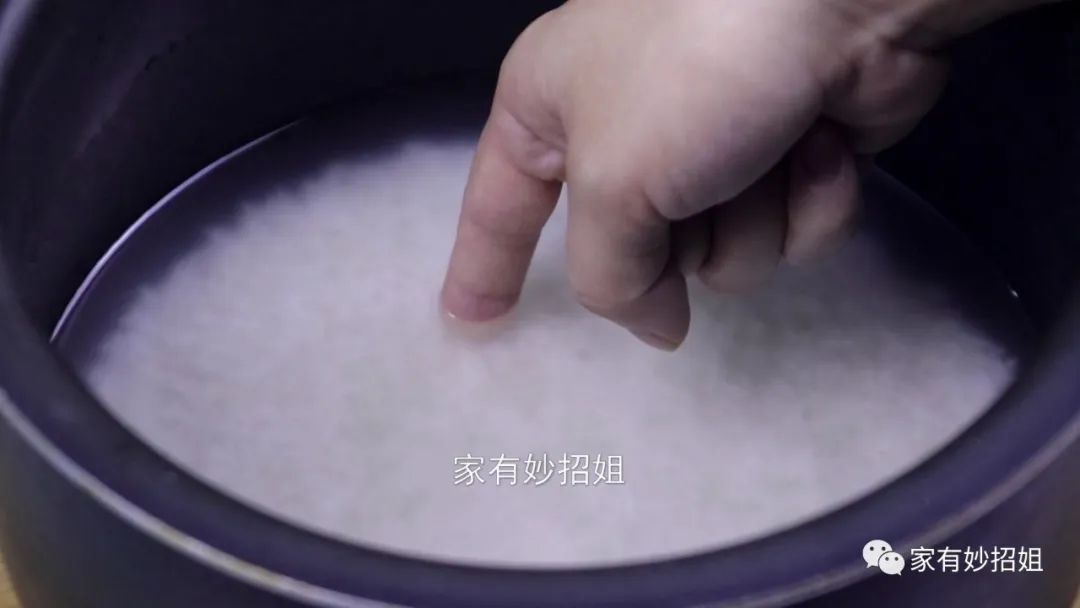 大米淘洗好,接下来一步就是要加水了,很多朋友都不清楚到底要加多少水,大部分时候都跟着感觉走的,但要是水加多了,煮出来的米饭就会很稀偏软。水要是加少了,煮出来的大米饭就会很硬,甚至还会出现夹生的情况。我们加水的时候只需要用手指测量一下就可以了,把我们的食指竖着放在米面上,水位只要高过米面半节食指的高度就可以了。