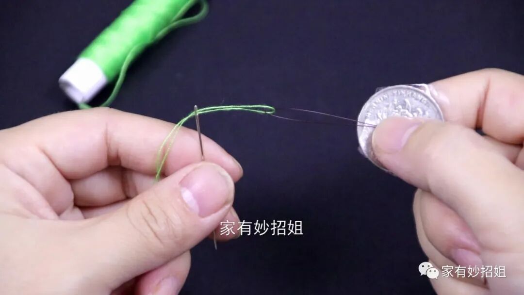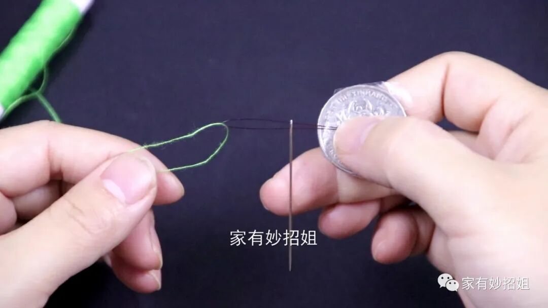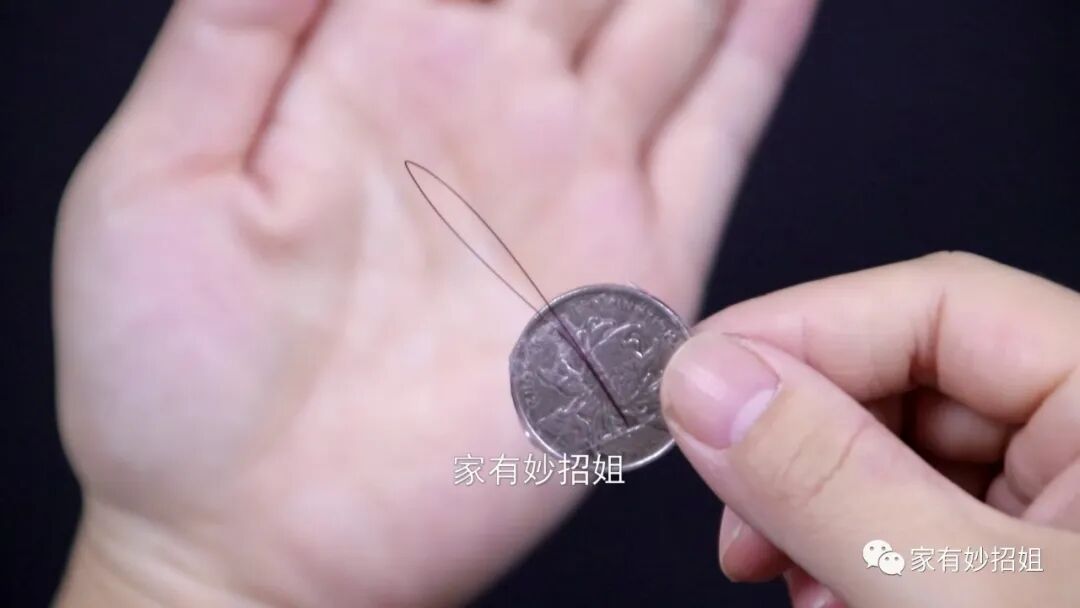 接下来,我们只需要把扫把丝的尖角穿过针眼,在扫把丝的顶部有一个小圈,我们把线穿进这个圈子里,然后把扫把丝往回拉,这样线也会一同被带过针眼,我们的线也就穿好了,非常的简单快速。这个硬币上粘的扫把丝用完后,我们可以把它放到针线盒里,下次还可以继续使用。