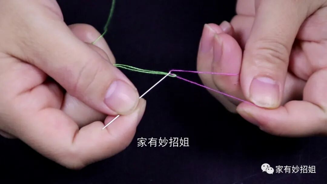 接着,我们再抓住针和原来的线头,另一只手抓住新线,再把线头往一边拉,拉到针眼上。