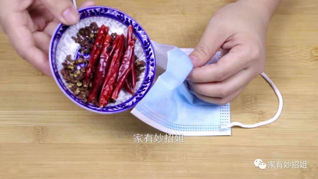干辣椒花椒都是我们厨房里常用的一种调味品,它们有一个共同的特点,就是味道特别的刺激、呛人。其实我们就可以利用它们的这一特性来驱除米虫。方法也很简单,我们先准备一个一次性口罩,将口罩的一端剪开,口罩是有三层无纺布的,扯开就成了一个口袋的样子。我们只要在里面放上一小把的干辣椒和花椒就可以了。