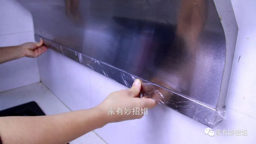 不过为了下次更方便清洁,我们再把它安装回去之前,还要处理一下。也很简单,我们准备一点保鲜膜,用保鲜膜将整个油烟机的底部都覆盖住,要是保鲜膜比较大的话,多余的部分可以剪掉不要。