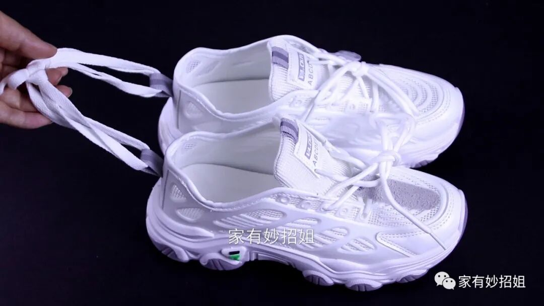 当鞋子穿脏后,我们就需要将鞋子清洗干净了。洗好的鞋子大家是如何晾晒的呢?可能很多朋友就只是将它平放在窗台,这样往往要晒上几天鞋子才会干。其实晒鞋子,我们也可以利用上后面的小尾巴,只需要找一个带有两个钩子的衣架,然后把鞋尾巴挂在衣架的钩子上,鞋子就会倒立着。这样再去晾晒的话,里面的水分就会快速流出,也就能将鞋子快速的晾干了。要如果没有这种带钩子的衣架,我们也可以在鞋尾巴上穿根鞋带,然后固定在衣架上面,这样晾晒效果也是一样的。