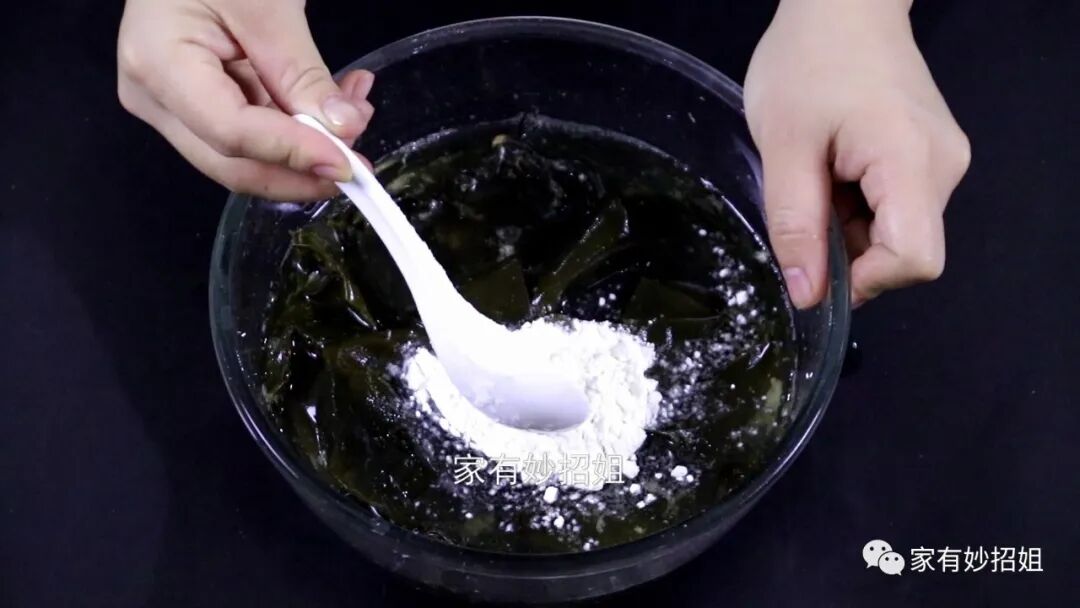 海带泡发之后,接着就需要来清洗海带了。我们可以在里面加入一勺食盐,然后再倒入一大勺面粉,接着我们再用手来抓洗一下,食盐有杀菌消毒的作用,可以将海带中的细菌消灭掉。而面粉具有吸附的作用,可以将海带表面的一些泥沙脏东西之类的都吸附出来。