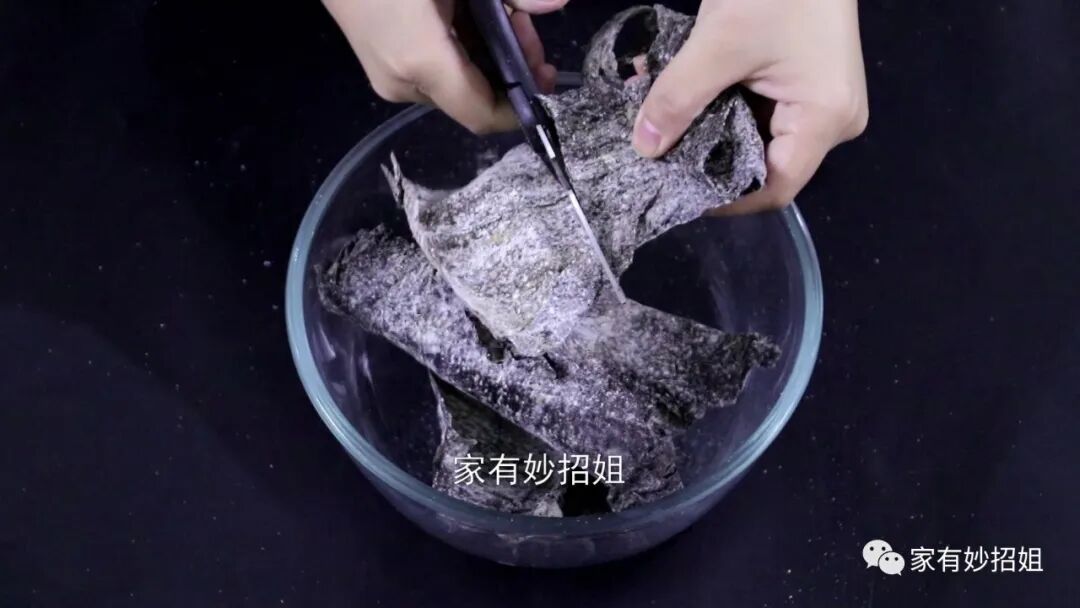 其实泡发海带也是有技巧的,我们先将海带用剪刀剪成一小段一小段的。如果我们将海带一整块的泡发,速度就会比较慢,而我们剪成一小段一小段的,就可以增加海带的吸水速度了。