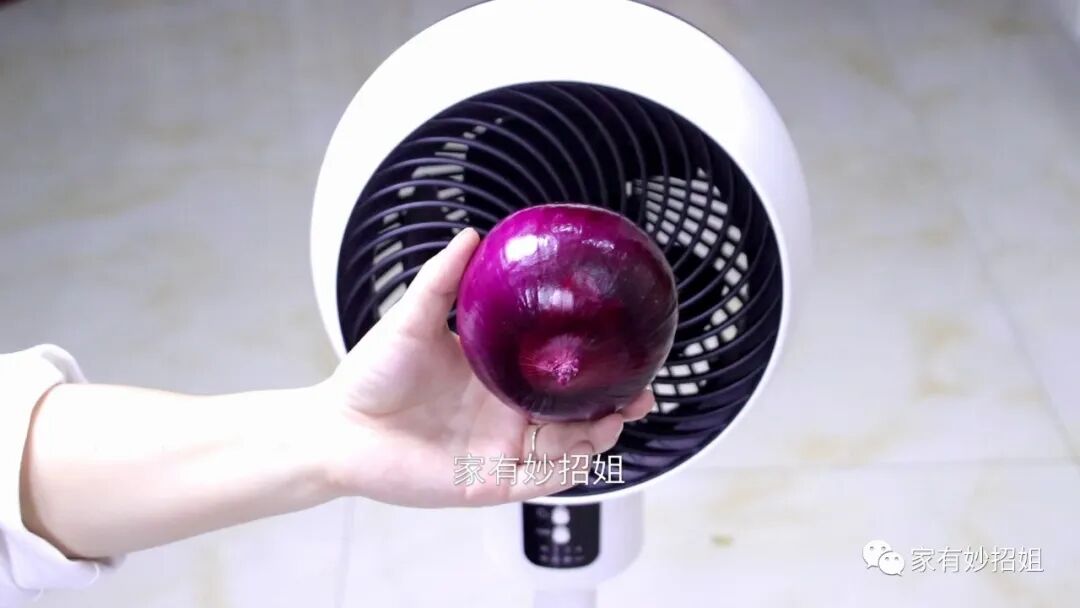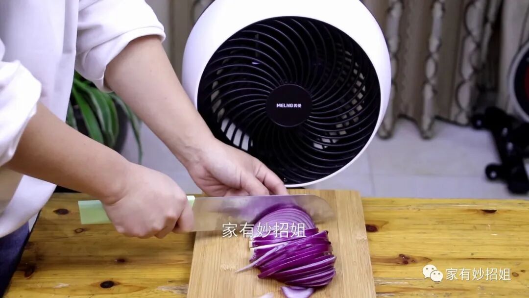这样我们边切洋葱边吹的话,洋葱产生的气体就会被风扇的风吹走,刺激的气味就影响不到我们的眼睛了。