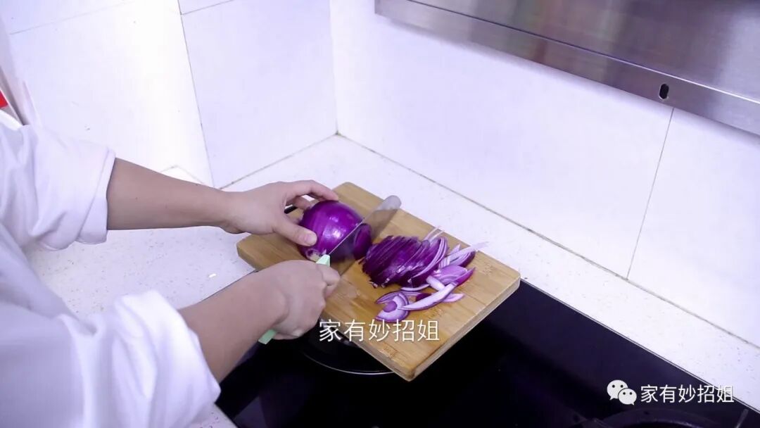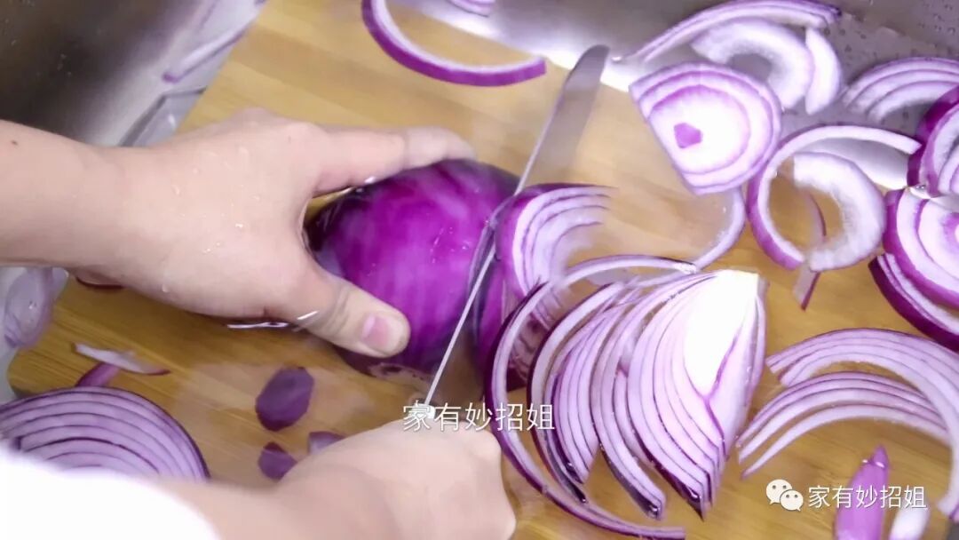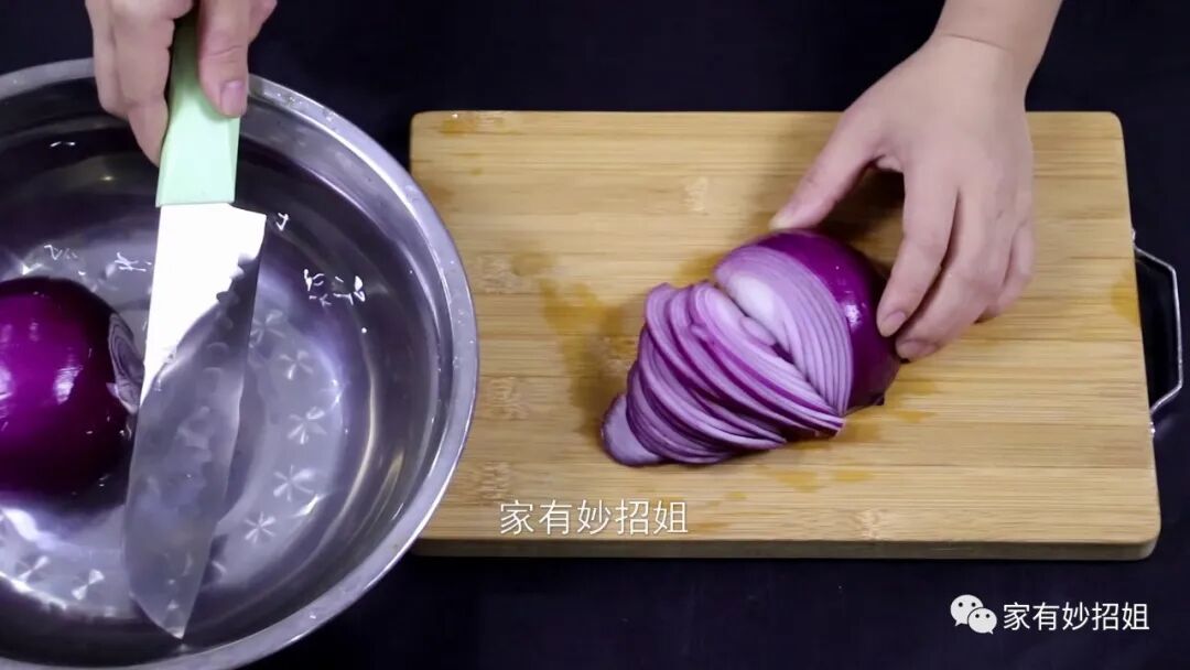 等浸泡好了之后,我们再来切洋葱,就可以发现洋葱的气味已经没有那么刺眼了。要是在切的过程中还有刺眼的感觉,我们也可以时不时地把刀放到水里沾湿,这样再来切洋葱,就不会再有流泪的感觉了。