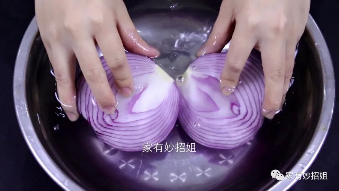 除了用这个方法,我们也可以直接把洋葱放到水里面来切。这样就完全隔绝了洋葱散发出来的刺激性气体,我们的眼睛就不会感觉到不舒服了。