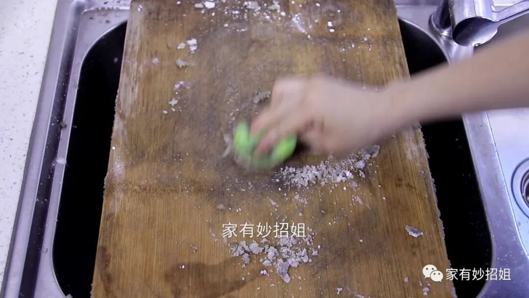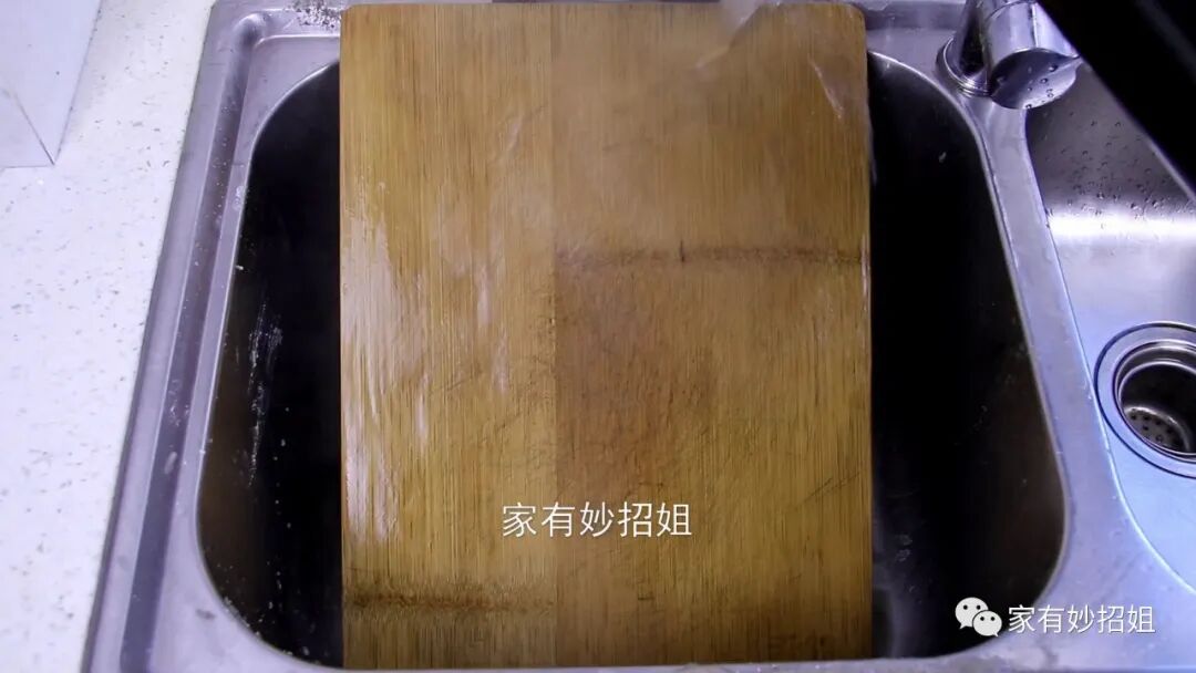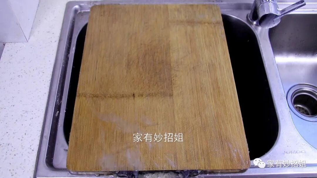 等擦拭得差不多了,我们再用清水将菜板表面的残留冲洗干净,可以看到菜板就被清洁得很干净了。