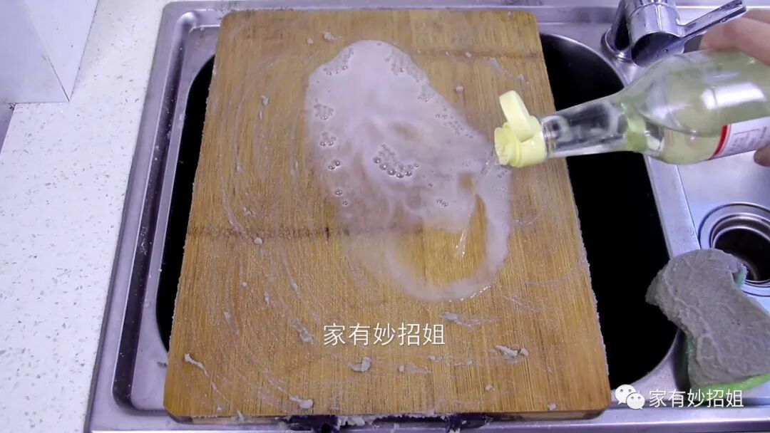接下来我们再往菜板上倒上一些白醋,然后继续擦拭。白醋不仅可以去除菜板上的异味,它还有软化的作用,能将菜板上一些比较顽固的污渍软化掉,我们通过反复擦拭就能将菜板彻底的清洁干净了。