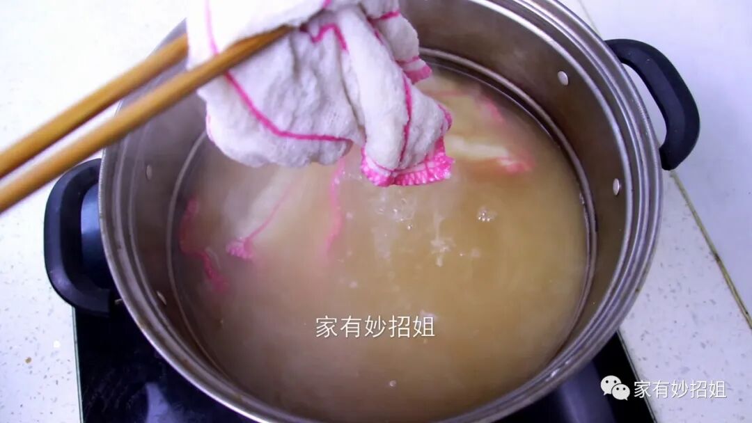 等到锅中的水煮开后,我们就可以将火关掉了,先不要动它,继续让抹布在这个碱水中浸泡。等到水温不那么烫手的时候,我们把抹布搓一搓,然后放入冷水中再将抹布搓洗一下。
