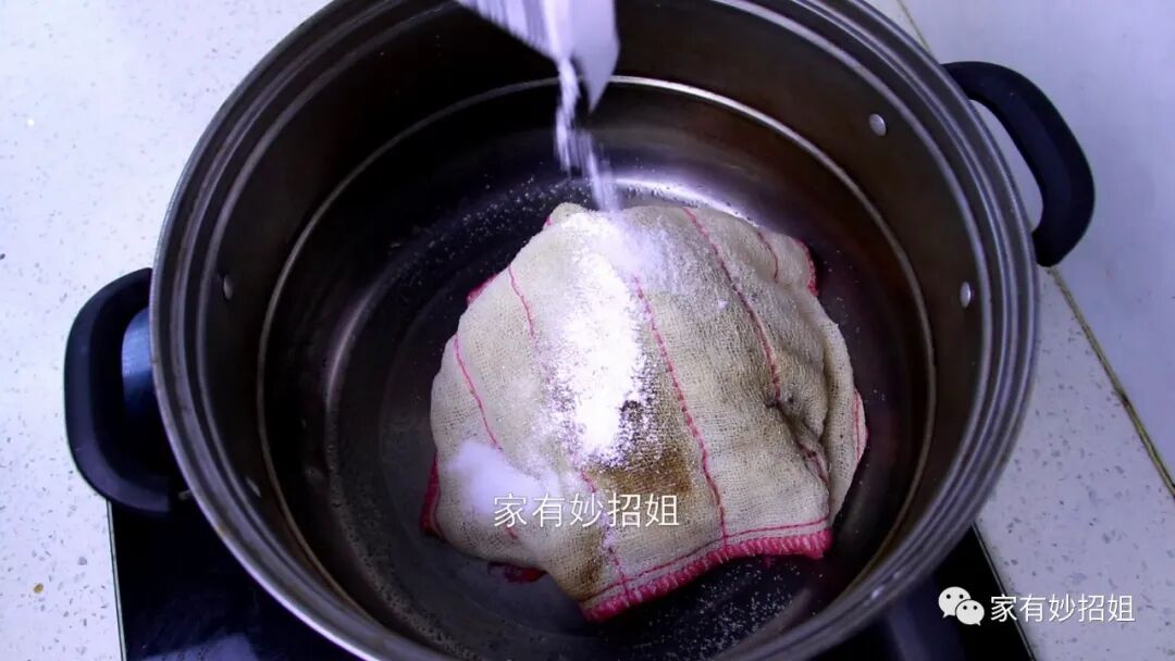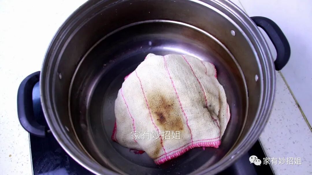 其实清洁抹布的方法也很简单,我们先准备一个不常用的旧锅,把要清洗的抹布放在锅中。