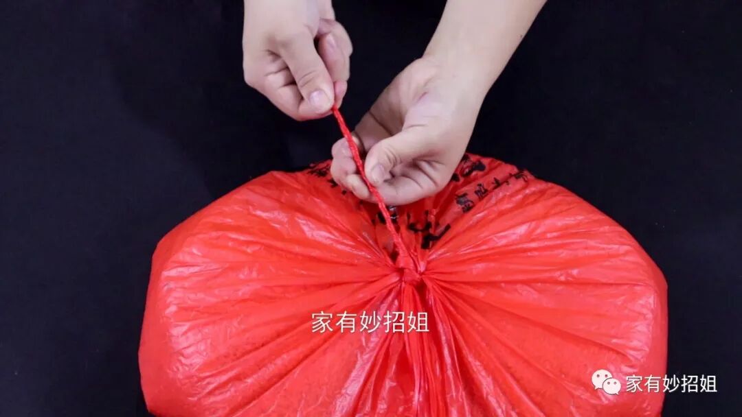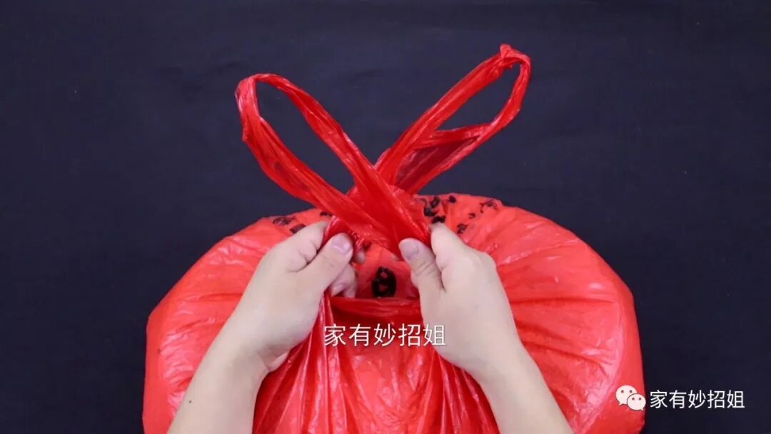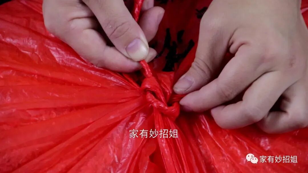 只需要稍微用力,这个提手就被扯了出来。我们的袋口就打开了,非常的快速简单。这个节我们不仅可以用它来固定塑料袋,像平时的两根绳子,需要临时地接起来,我们也可以用这个方法。如果今天的文章对您有帮助,那就点一个关注,点一个赞,感谢您的支持。