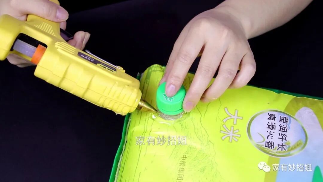 接下来,我们只需要把改造好的塑料瓶塞在米袋刚刚剪开的小洞里面,然后用热熔胶在塑料瓶的四周打一圈,把塑料瓶和米袋紧紧地粘在一起。