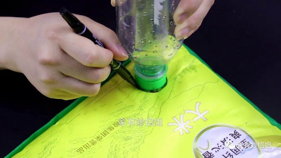 其实根本不用这么麻烦,这个封口线也不用拆开,我们只需要准备一个塑料瓶,就是平时我们喝饮料或矿泉水的瓶子都可以。我们先把塑料瓶瓶口的位置比在米袋的下半部分,然后用记号笔沿着塑料瓶的瓶口,在米袋上标记一个圆形。