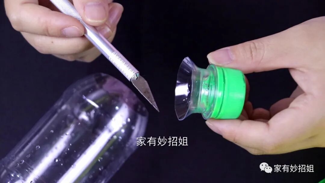 接着,我们再把塑料瓶改造一下,把塑料瓶瓶口下方两厘米的位置给它剪掉,这样一个塑料瓶就改造好了。