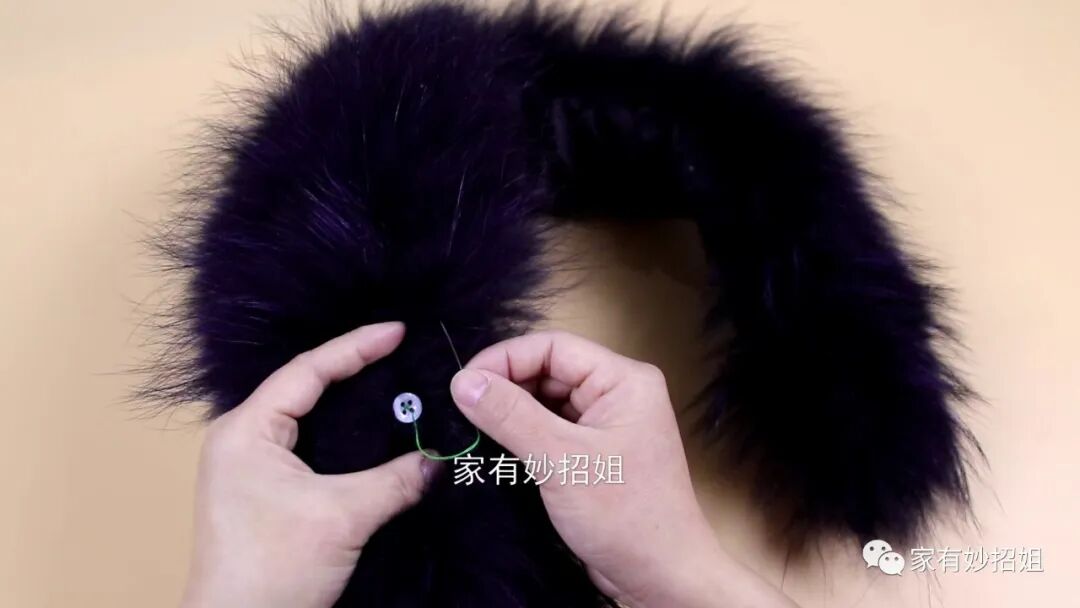 妙用二:制作围脖。这个毛领,我们还可以将它制作成一个围脖。方法也特别的简单,我们先在毛领的一端用针线缝上一个扣子。在毛领的另一边,用有弹性的小皮筋缝上一个小圈。有些毛领是自带这种小皮筋的,那么我们就不需要缝制了。