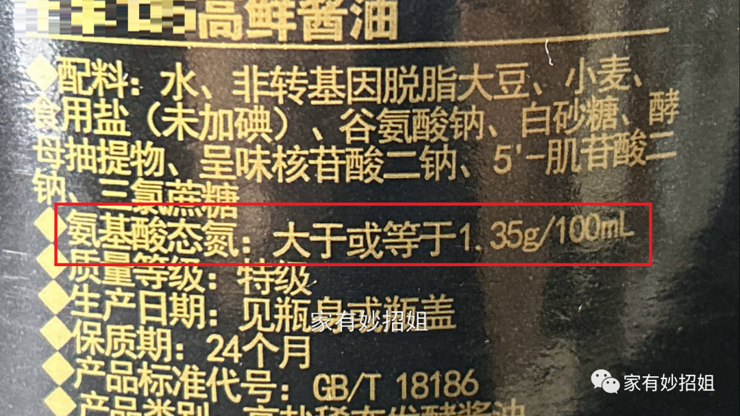 在酱油瓶身上都会贴有标签纸,在标签纸上有注明配料、生产标准号以及各种产品的信息,我们找到标签纸上的氨基酸态氮含量。多观察几瓶酱油我们就会发现,这个氨基酸态氮含量是有所差异的,国家标准的氨基酸态氮含量不低于0.4g每100ml,氨基酸态氮的含量越高,就说明这个酱油的品质就越好,它的鲜味足,营养更高。所以我们在挑选酱油的时候,也要注意观察一下这个氨基酸态氮的含量,要是低于0.4g每100ml的酱油,我们就不要选购了。