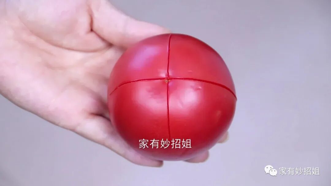 经过半个小时的冷冻,西红柿的表皮已经微微冻硬了。这个时候,我们只需要用手指不断地搓西红柿的表皮。在揉搓的过程中,西红柿的表皮就会起皱。我们将整个西红柿搓上一圈,接着在西红柿上切个十字花刀,