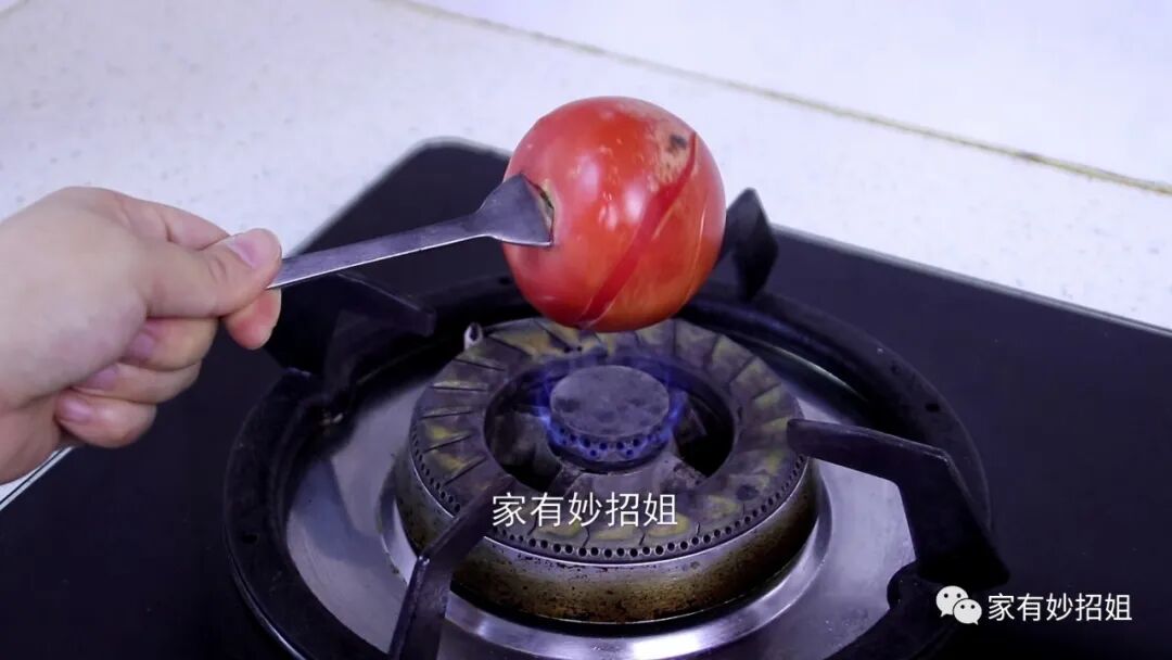 方法一:火烤法。在西红柿的底部位置,都会有一个硬心,我们可以拿一根筷子或者是一个叉子,插进西红柿的硬心里面,把西红柿固定住。接下来,我们再把燃气灶打开,调到最小火,把西红柿放在火上烤一烤。