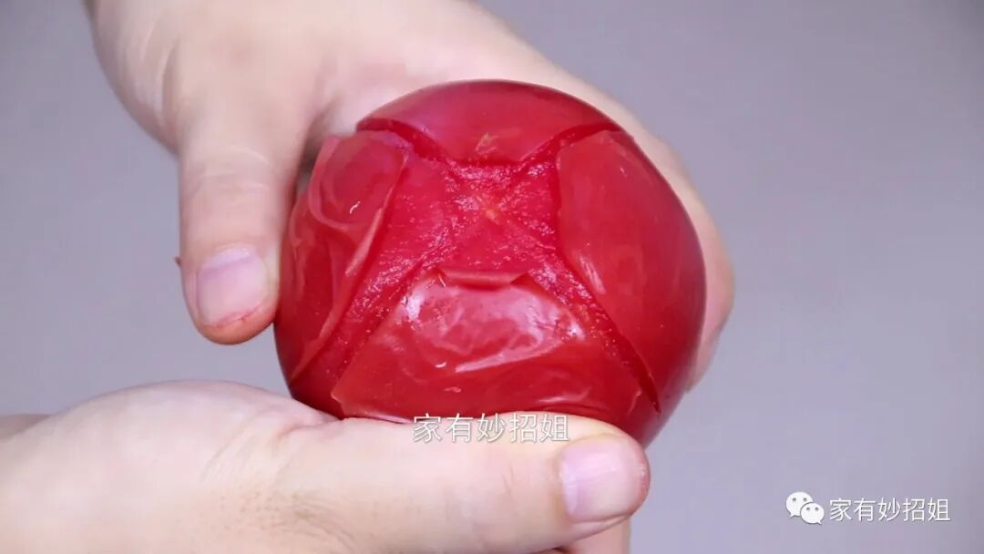 然后顺着切开的裂口就可以很轻松地将西红柿的表皮撕下来了。