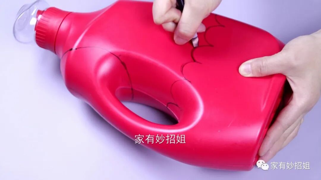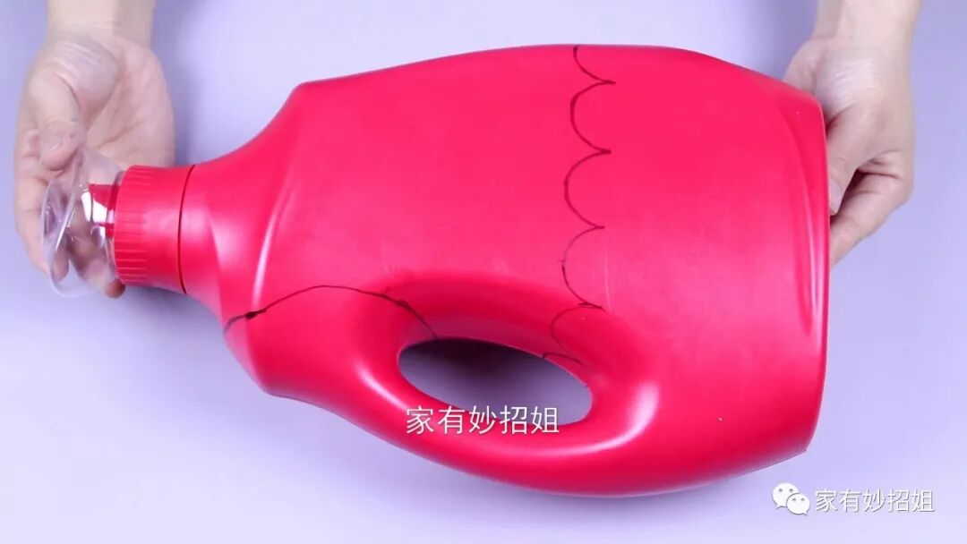 首先我们需要准备一个用完的洗衣液空瓶,把瓶子涮洗一下,将里面残留的洗衣液清洗干净。接着我们再把瓶身上的标签纸给它撕掉,在撕除这个标签纸的时候,我们可以先用吹风机的热风吹一吹,通过加热来软化胶质,这样就可以很轻松的将标签纸去除了,而且还不会残留胶印。把标签纸去除后,我们再准备一支记号笔,用记号笔在洗衣液瓶的把手上方标记一圈,然后在瓶身中间靠下一点的位置画出一圈波浪形,这个波浪形我们可以借助一个饮料瓶盖比着来画。
