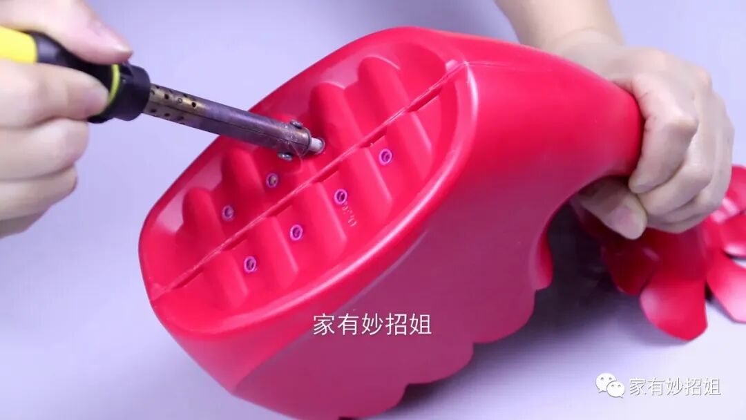 最后,我们还需要在瓶底的部分戳上一些小孔洞。因为花盆种植绿植的时候是需要浇水的,那么就需要在底部戳一些小洞,方便沥水。如果家里有电烙铁的,我们可以直接用电烙铁来戳洞,洞也不需要戳的太多了。要是没有电烙铁的话,我们也可以用根铁钉,把铁钉烧红后再来戳洞也是非常方便快速的。