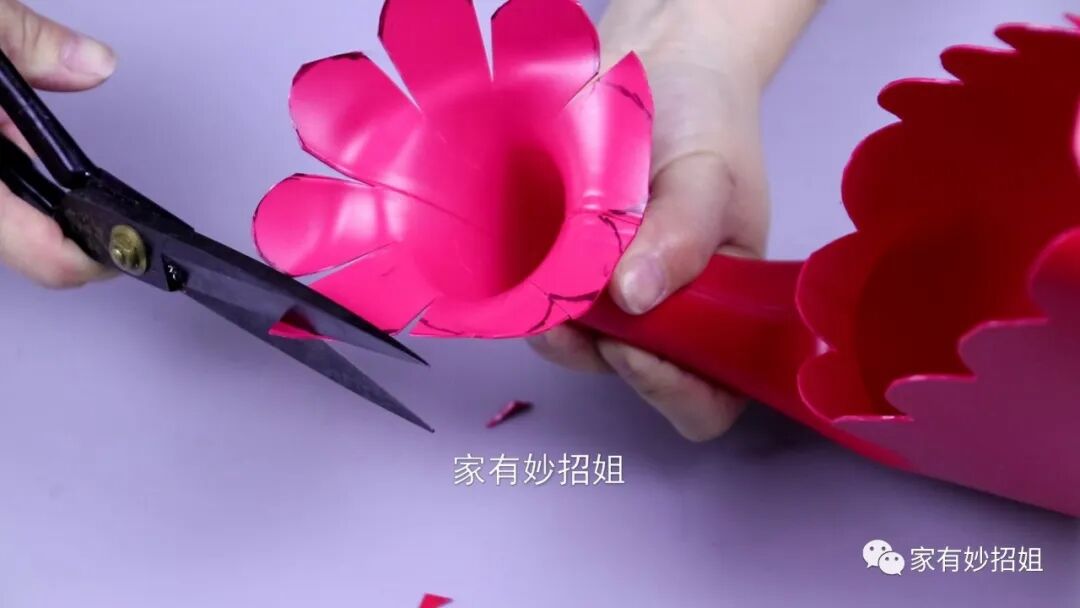 切割好后瓶身的上半部分就不需要了,接下来我们将把手的部分改造一下,先将把手的上方分成八等份,然后再将这八等份都剪开来,接着再将这八等份都修剪一下,把它修剪成一个花瓣的形状。全部修剪好,就变成了一朵漂亮的八瓣花了,这样瓶身就全部改造完成了。