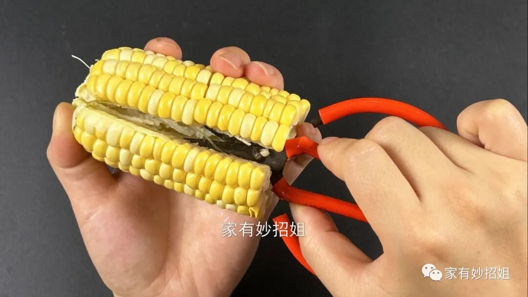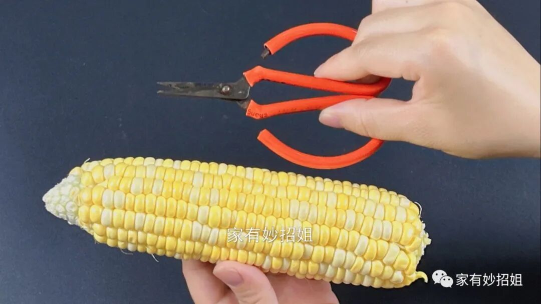 像我以前剥玉米粒都是一颗一颗慢慢剥的,这样非常的浪费时间,而且玉米粒都会剥碎来,里面的汁水也会弄得到处都是。甚至有时候没有耐心来剥,就会直接用刀来切,这样就导致玉米粒都被切碎了,而且还有很多的玉米粒残留在玉米棒上,非常的浪费。其实剥玉米粒很简单,我们只需要用上一把剪刀就可以了。先将玉米的外皮剥掉,然后把玉米从中间掰断,将玉米分成两段。