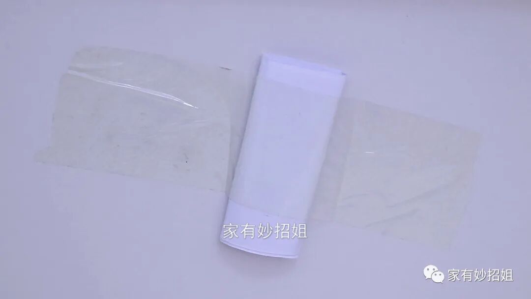 接着再准备一长段胶布,把胶布贴在卫生纸上,再将它贴在床头柜抽屉的隔板上。