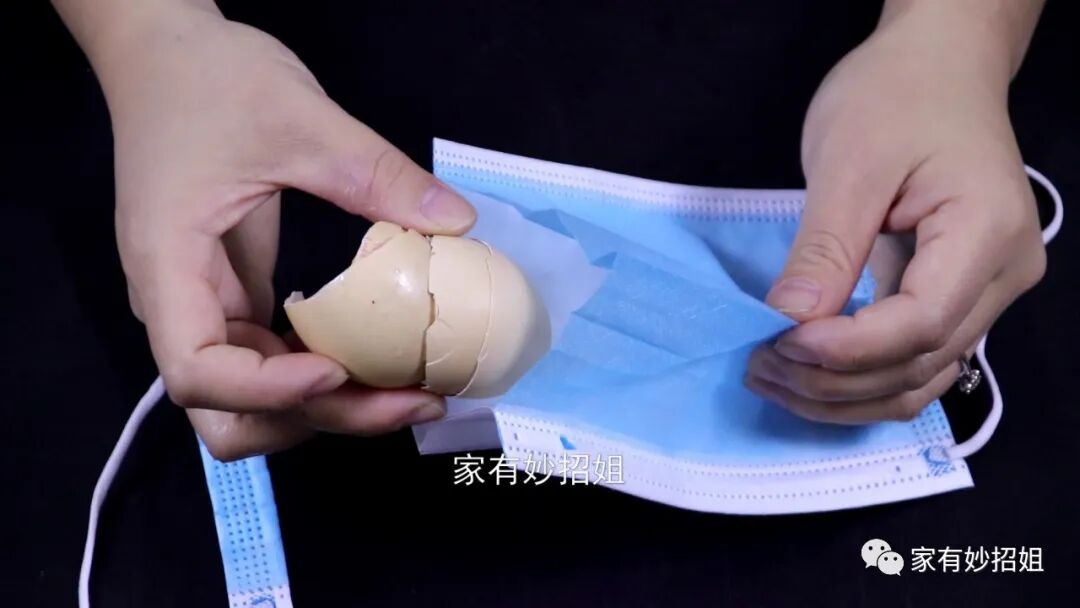 鸡蛋壳还可以用来清洁油烟机,方法也很简单,我们先准备一个一次性的口罩,用剪刀先将口罩的一端剪开。然后再准备两个鸡蛋壳,把鸡蛋壳稍微捏碎一点后放在口罩里面,然后用剪下来的口罩绳将口罩扎紧,这样就完成了。