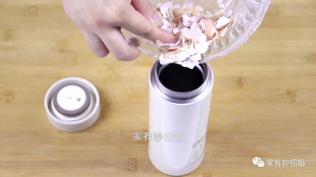 接着,我们只需要将盖子盖紧,把保温杯抓在手上摇晃一下。这样就可以将里面的水垢去除干净了。这是因为鸡蛋壳的主要成分是碳酸钙,碳酸钙在高温环境中具有超强的活性,能促使杯底和杯壁上的水垢分解。而且在不停摇晃的过程中,鸡蛋壳也会一直和杯壁发生剐蹭,这样就能将杯壁及杯底的污渍都清洁掉了。