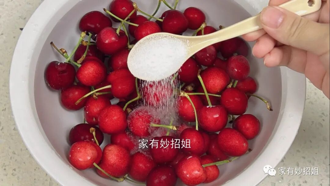 冲洗好,再准备一个大点的容器,将樱桃倒在容器中,然后加入没过樱桃的清水。接着再往里面倒入一勺食盐,食盐具有杀菌的作用,而且盐水还会刺激隐藏在樱桃里面的小虫子,让小虫子能自动跑出来。