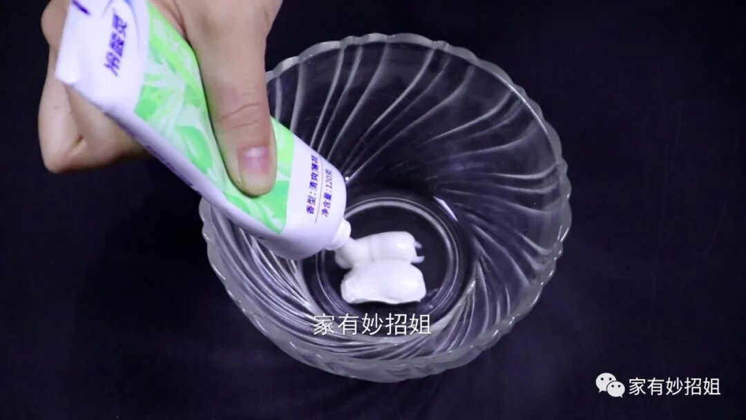 操作步骤:我们先拿上一个碗,在碗里面挤入一段牙膏,牙膏可以稍微多挤上一点。我们用来做胶水的牙膏,最好是选用白色的。虽然现在的牙膏也是多种多样、五颜六色的,但是白色牙膏它的粘性更好一些。