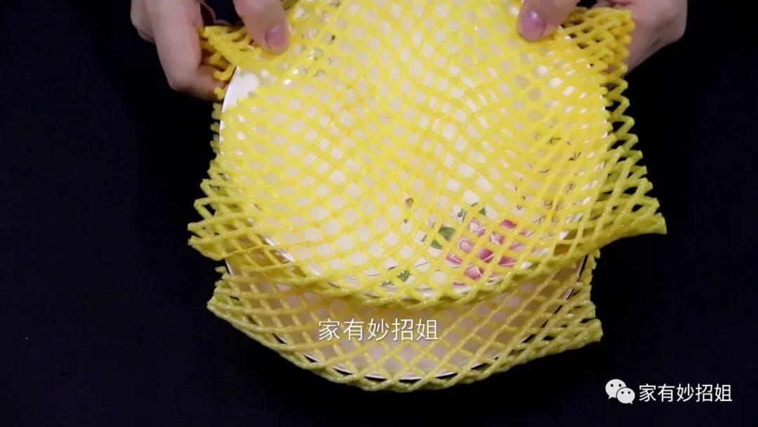 妙用三:收纳盘子。相信每个家庭都会有一些备用的碗盘,像平时自己家里人吃饭就只用几个盘子,但是如果有客人来到家里吃饭,用的碗盘就会比较多了。当这些碗盘用好,我们又需要将它收纳起来。为了防止盘子与盘子之间发生碰撞,而出现破裂的情况,我们可以用水果网套将盘子套起来。像一些哈密瓜之类的比较大的水果,他的水果网套也是比较大的,我们可以收集上几个这样的水果网套,只需要将盘子套在里面就可以了。
