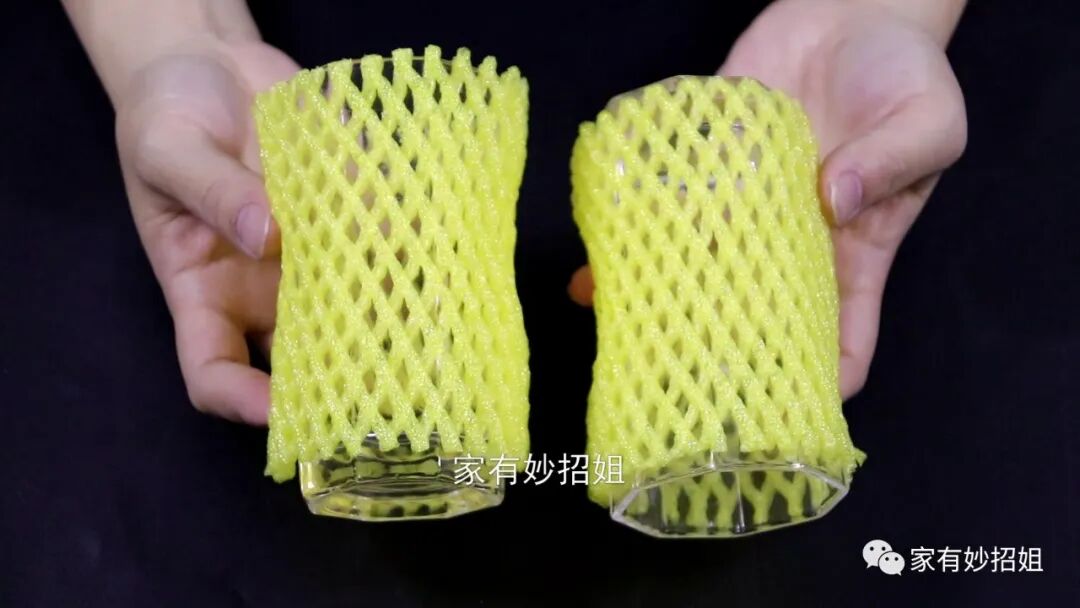 妙用一:保护玻璃杯。水果网套都是海绵的,摸起来软软的,它可以保护水果,那么也可以保护我们的杯子。家里的杯子如果需要收纳放在盒子里,我们就可以先用水果网套将杯子套起来,然后再放在盒子里,这样就能避免杯子之间,发生碰撞而出现损坏的情况。不仅如此,平常我们用杯子装开水,在杯子上套上一个水果网套,还可以起到隔热的作用,这样我们端杯子喝热水就不会被烫到了。