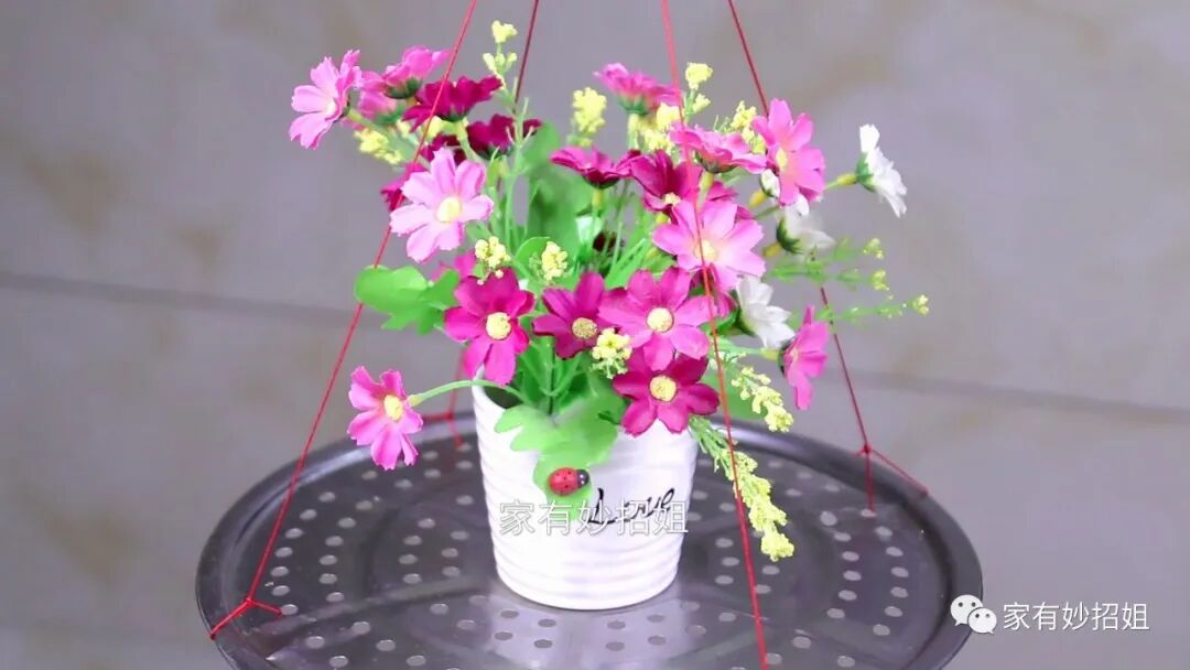 它除了可以用来晾晒干货,我们还可以把它当做一个吊篮垫。只需要将盆栽放在中间,然后把它挂在阳台上,将它当成一个吊兰花盆,也是非常美观的。