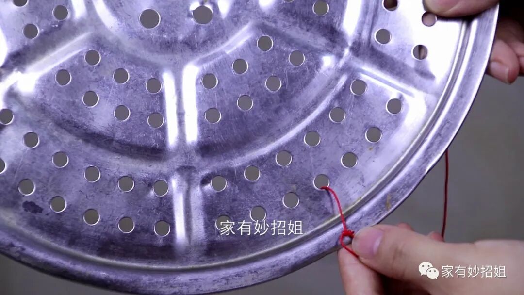 妙用三:晾晒干货。在蒸屉的上面都是有很多小孔洞的,我们可以拿上四根一样长的绳子。将绳子穿进蒸屉四周边缘的孔洞里面,然后打结固定好,这样就变成了一个晾晒干货的架子。